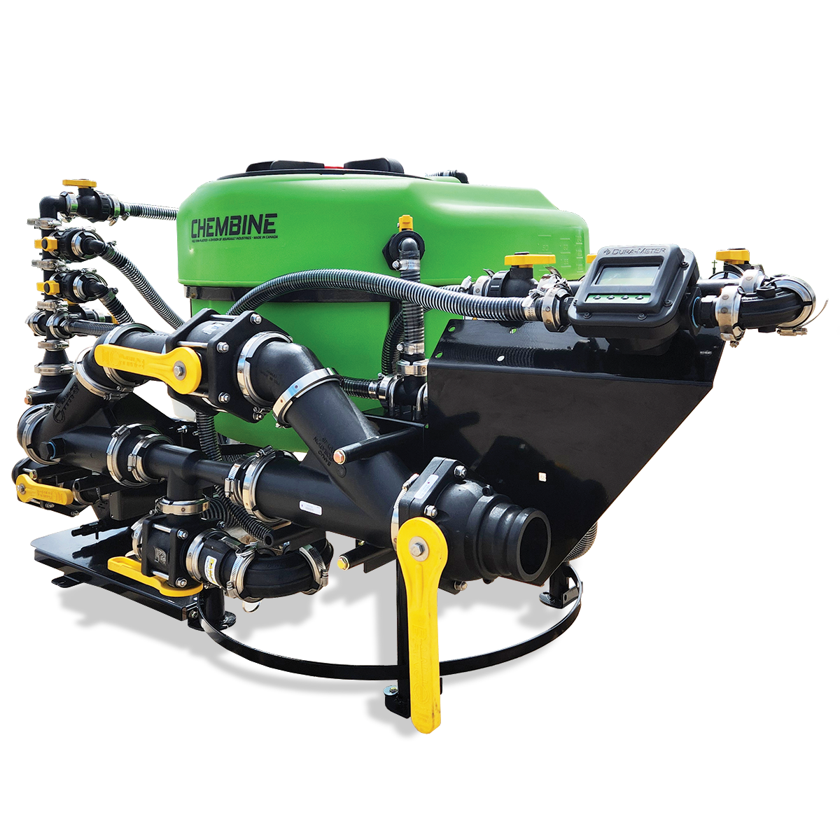 When designing the tank cradle, where the tank sits onto the powder-coated metal frame, a gentle slope was incorporated so material does not get caught on a ledge, which can be an inconvenience with some competitors’ models. The light green colour is well suited to give customers a good view of the tank liquid level. An optional quick attach metal “pump frame” is available for models purchased without the pump. The CHEMBINE utilizes the Banjo threadless plumbing system. Designed and manufactured in St. Brieux, Saskatchewan, Canada.