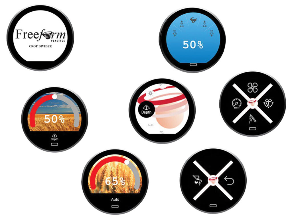 With the electric version you will have a Rotary Touch Encoder installed in your cab for easy operation of the divider. By swiping or touching the Rotary Touch Encoder Home Screen you will access other options to control your dividers or up to 4 Auxiliary functions. Swiping the screen down puts you to the “Express Up” button in case you need to quickly lift them for an obstacle and then hitting the “Resume” puts them back where you had them set!